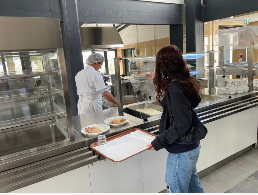 Något vi reagerat över och även pratat med rektorn om är hur mycket mat skolan kastar. Här i skolan lägger bespisningspersonalen upp maten till eleverna och det är stora portioner som delas ut. Varje dag serveras det soppa till förrätt, en varmrätt och frukt eller yoghurt till efterrätt. Det serveras bara vatten att dricka.
