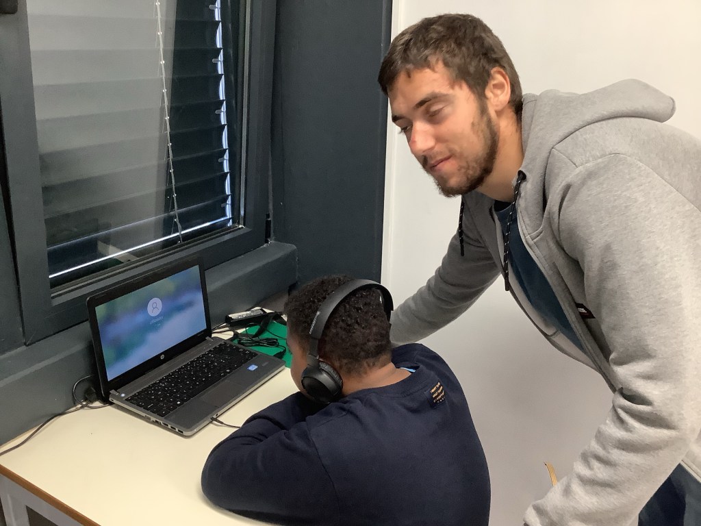 En före detta elev jobbade varje dag i klassen, tyvärr utan lön men han älskar sitt jobb och vill inte vara ledig. Här är han med Rui och hjälper till. Ett sätt att jobba med inkludering som var tydligt på den här skolan.