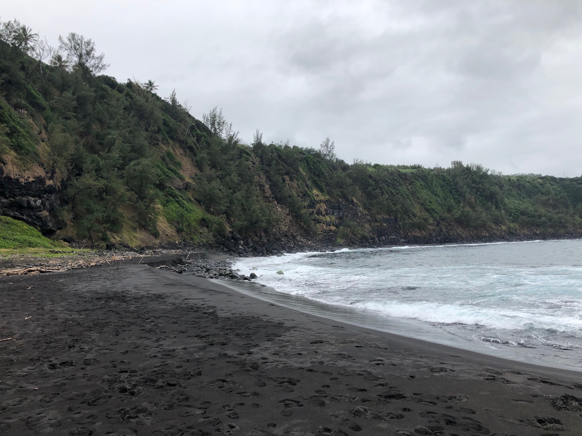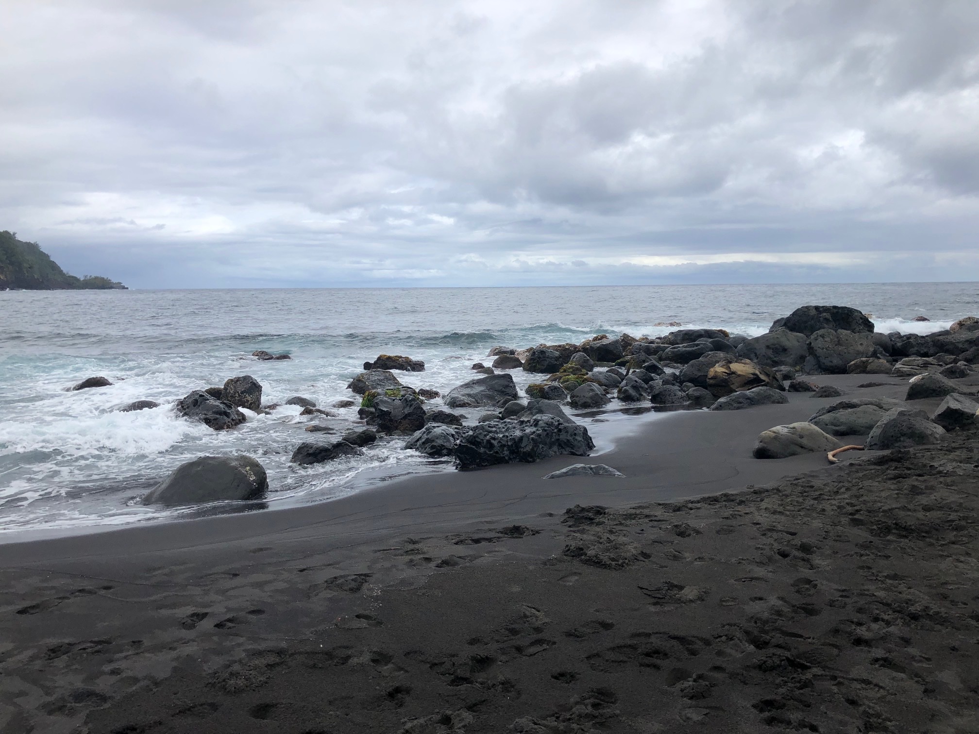 Det uteblivna doppet till trots så var stranden väl värt ett besök, sanden var nämligen svart. En riktig lavastrand fullt med lavastenar som såg ut som månstenar, vågorna slog in med kraft mot stenarna och skapade en vacker och dramatisk bild som inte går att återges i ett foto. Ett försök till det kommer dock ändå.