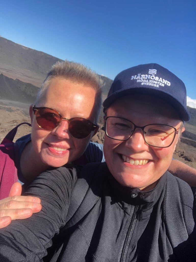 Den första biten uppför vulkanen gick fint men efter någon timme så vände leden runt på baksidan där det blev tuffare stigar samtidigt som det blåste in moln som gjorde det svårt att se. Jag tyckte det var lite otäck då man inte visste vad som väntade längre fram. Till slut hade vi vandrat så högt upp att vi kom ovanför molnen och då fick vi se helt magiska vyer. Efter tre och en halvtimme så var äntligen jag och Carina framme vid vulkanens krater och synen var helt klart värt mödan!