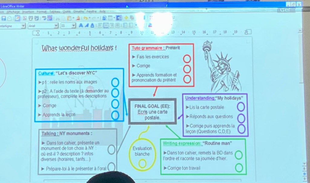 Idag var jag på en lektion där eleverna arbetade med ett material som läraren själv gjort. Lektionen började med gemensam repetition med att ta tema på verb. Därefter tog eleverna fram sina copybooks och följde denna planering. Färgerna angav i vilken plastmapp eleven skulle hämta materiel till momentet. Det fanns även rättningsblad att hämta för att själv rätta. Lärarinnan gick runt och hjälpte till där det behövdes.