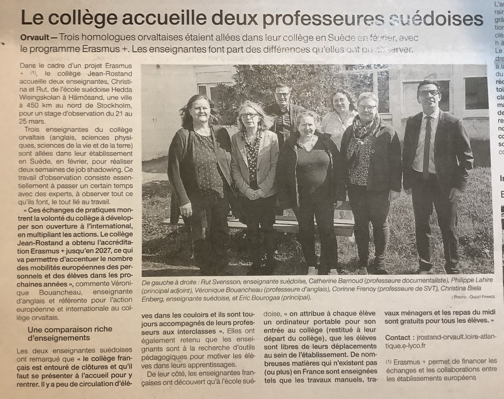 Vi har blivit uppmärksammade i lokalpressen. I artikeln berättas om Erasmusprojektet och om vad som förvånat oss mest i respektive skolsystem, t.ex vårt första intryck av en inhägnad skola där eleverna inte får röra sig fritt i skolbyggnaden. De franska lärarna berättar om att alla elever får en dator att använda under skoltiden i Sverige och att vi har flera ämnen som inte finns i den franska skolan (slöjd och hemkunskap).