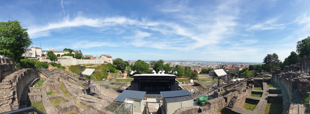 På vägen upp mot kyrkan passerade vi två av stadens tre amfiteatrar där det varje sommar hålls musikfestivaler. Man höll precis på att bygga upp scenerna. Fantastisk utsik som möjligen grumlades lite av den stekande hettan. Det var över 30 grader varmt hela veckan.