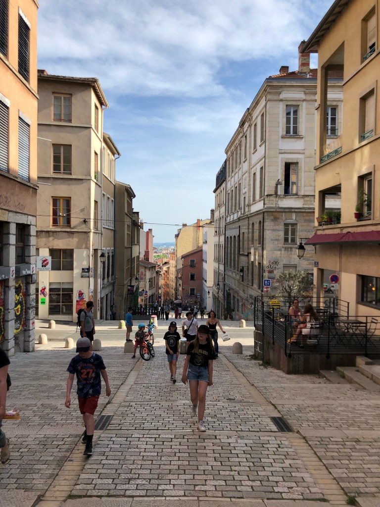Ner från kyrkan var det 650 trappsteg, med andra ord var det minst lika många upp… varma, trötta och sega i benen buffrade vi med glass nere vid floden innan vi gav oss på stans nästa kulle – La Croix-Rousse. Historisk har det varit sidenvävarnas stadsdel, en arbetarstadsdel som på många sätt liknar Söder i Stockholm. Väldigt mysigt med små gator och prång och hela tiden utsikt ut över stan mellan husen.
