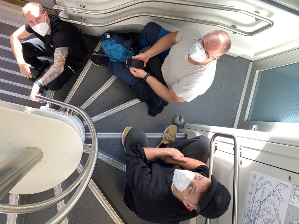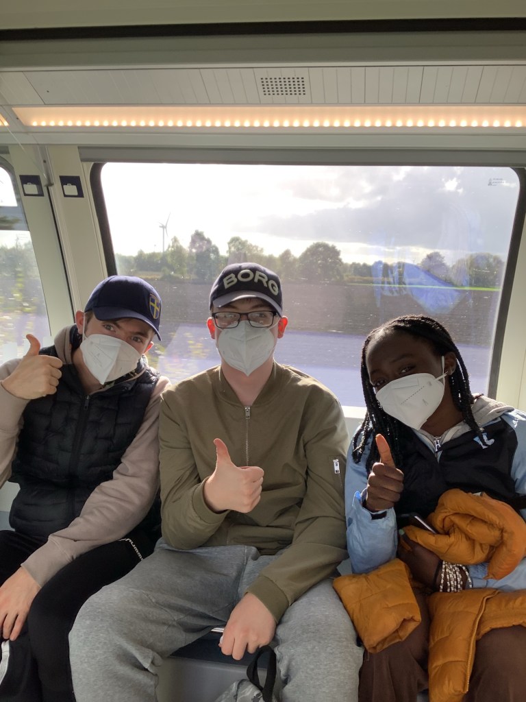 ..Efter två timmar i Padborg i tron om att bussen skulle komma så sitter vi nu på ett tåg, ingen buss. Inga platser fanns det kvar så som ni ser sitter lärarna i trappen och de flesta av oss elever i bagageutrymmet. Av någon anledning sitter Elly i en trappa en bit bort, ingen vet varför. 🤯