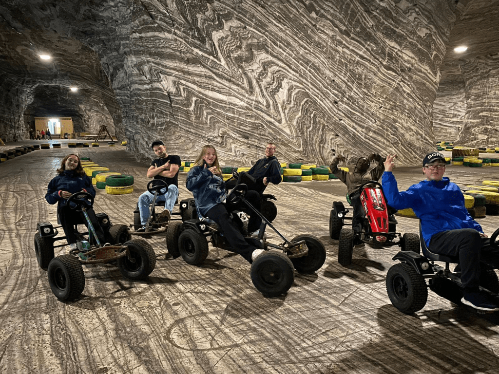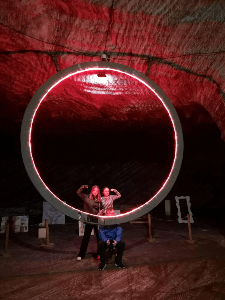 Salt gruvorna. Efter videosamtalet hoppade vi alla in i en buss för att åka mot en närliggande saltgruva. I saltgruvan fanns det massor av aktiviteter så som go cart och minigolf. Det fanns till och med en kyrka inne i gruvan. Vi hittade även en väldigt cool ringlight som ni ser på bilden här nedanför. Tydligen är det fullt av dessa saltgruvor i Rumänien och det finns möjlighet att köpa saltet som produceras där i en butik.