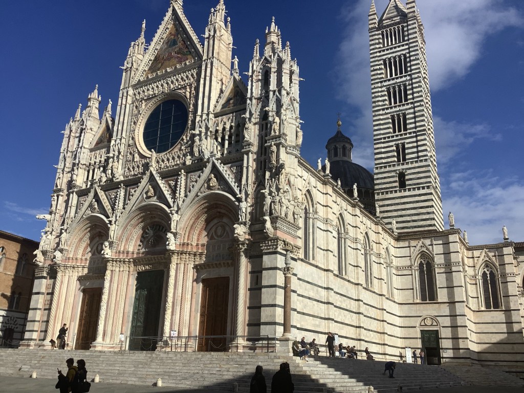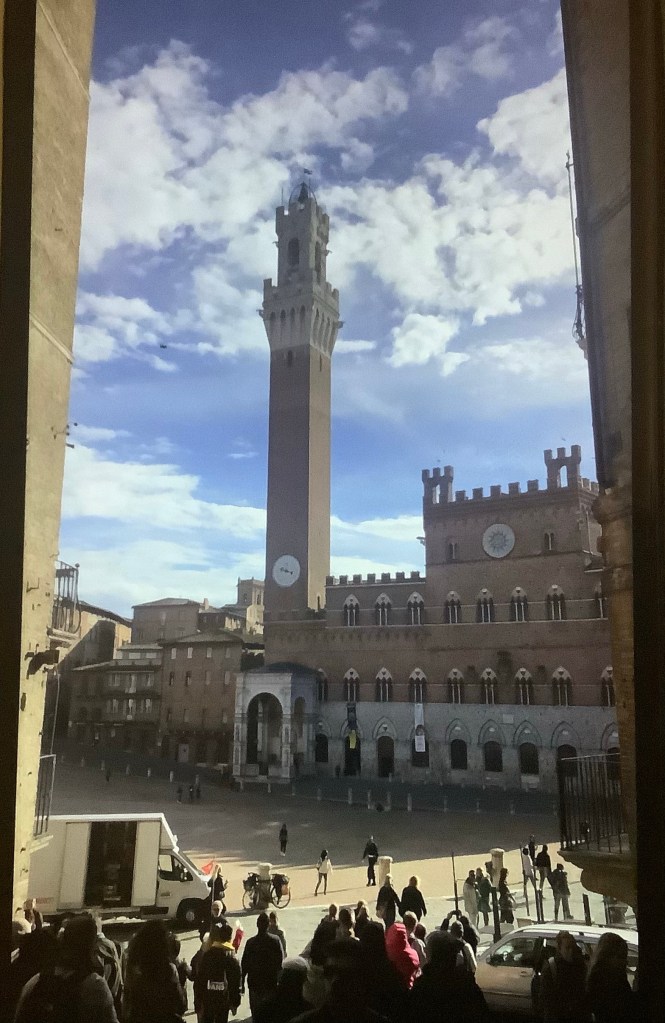 En mytomspunnen man från en känd film har hoppat runt mellan hustaken under tiden som stadens välkända hästkapplöpning pågått just runt denna piazza. Vem då? Annette hade stenkoll i alla fall och frågade om guiden hade samma koll. Det hade han. Hur är det med er? Vilken känd filmkaraktär var det som Anette hade koll på? Vi hann också med en sväng upp till kyrkan, Duomo di Siena, på toppen. Det var dock stängt, så även där finns mer att upptäcka. Sagolika målningar finns att avnjuta därinne.