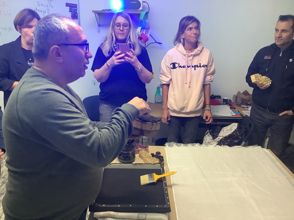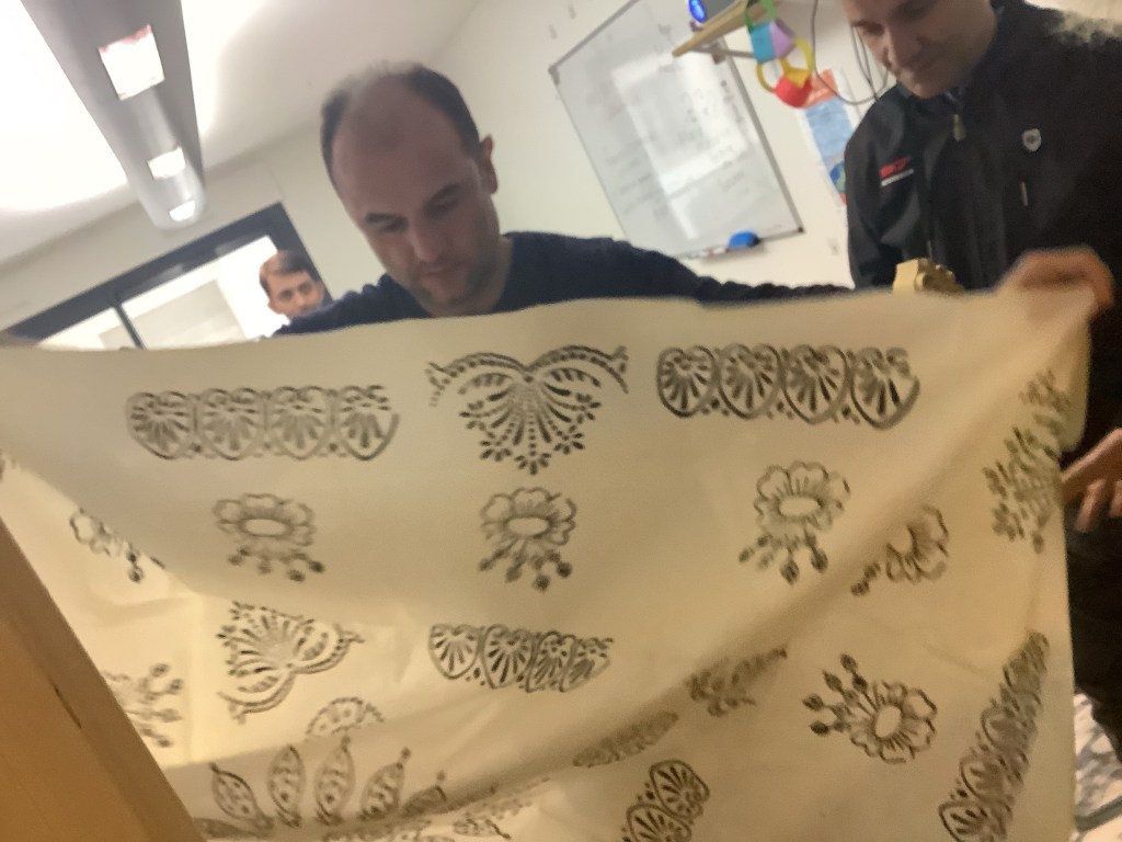 Alla kursdeltagare fick trycka med trästämplar gjorda av lind och färgen var tillverkad av rötter, så ingen syntetisk färg här./ Sara och Christina